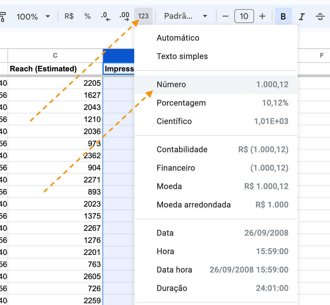 Clique no menu ‘Mais Formatações’ e, em seguida, escolha a opção ‘Número’ para corrigir a formatação.
